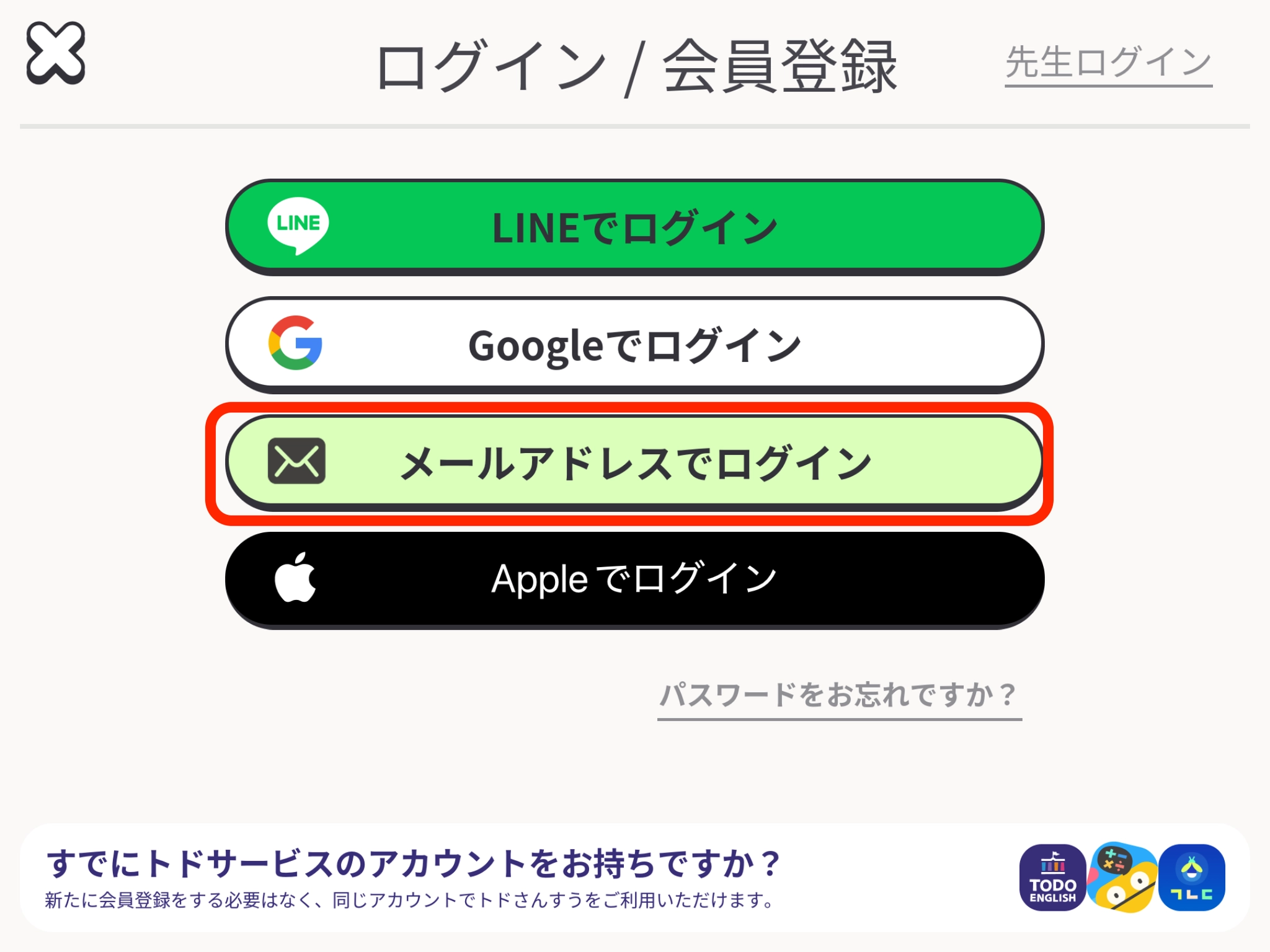 [スタート]をタップ後、以下画面で[メールアドレスでログイン]をタップしてください。