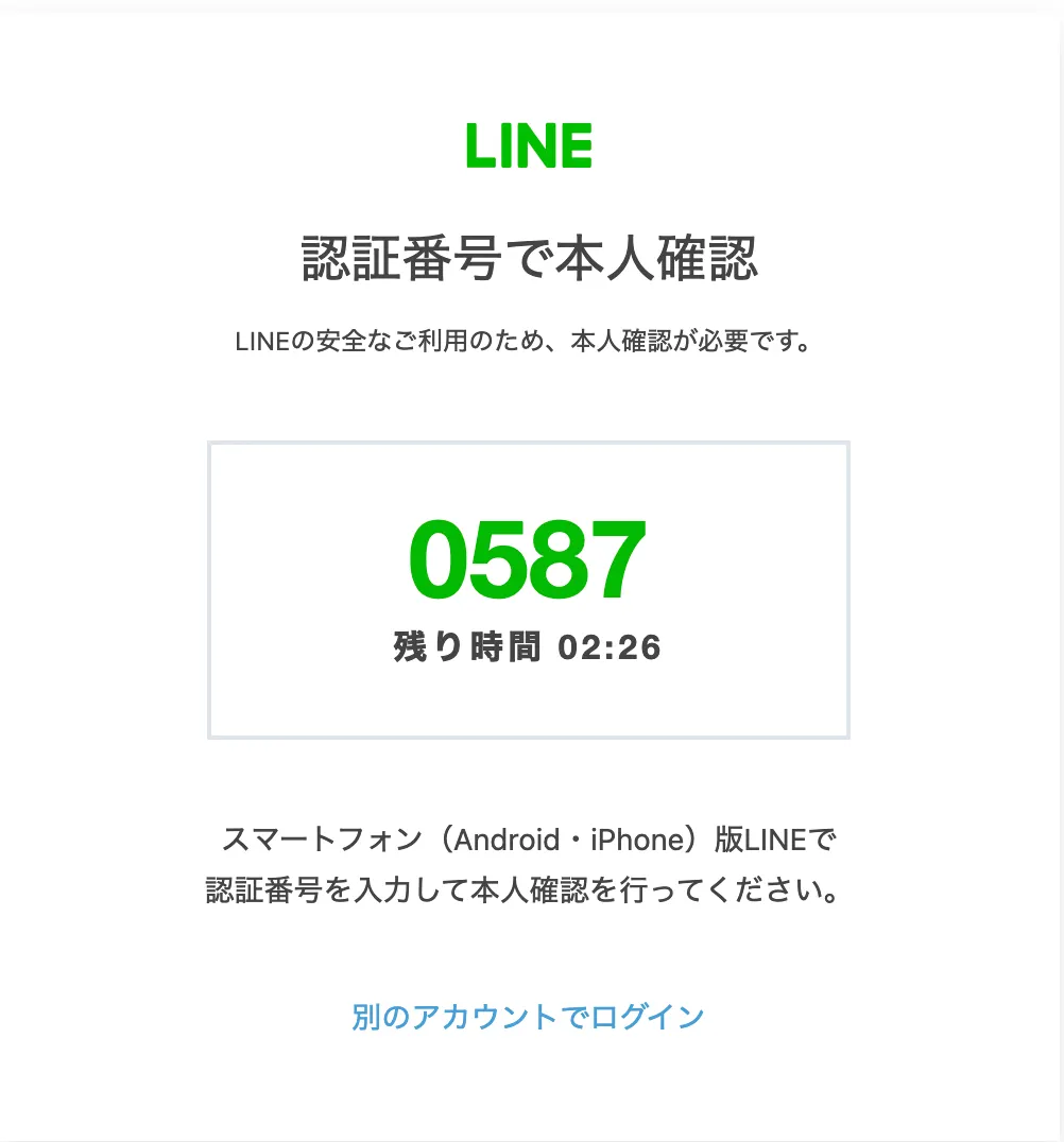 [QRコードログイン]を選択後、表示されたQRコードをLINEアプリのQRコードリーダーで読み取り、[ログイン]をタップすると、公式サイト上に認証番号が表示されます。スマートフォンの画面で4桁の認証番号を入力し、[本人確認]をタップしてください。