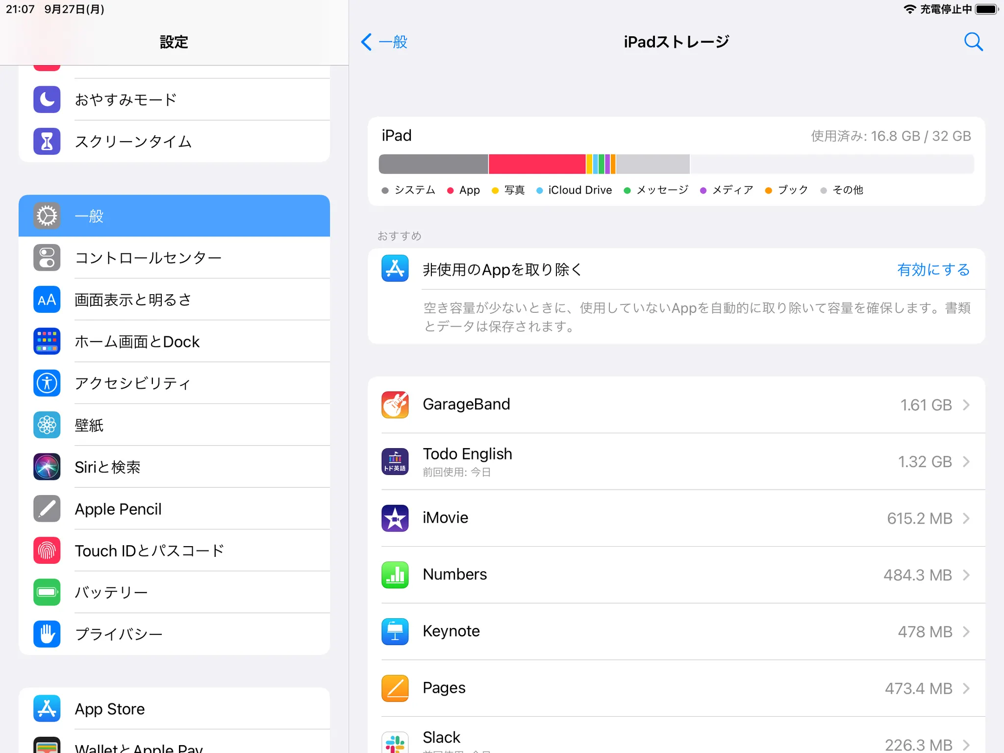 [設定]>[一般]>[ストレージ]を選択して、空き容量をご確認ください。空き容量が500MB未満の場合、保存容量を確保してください。