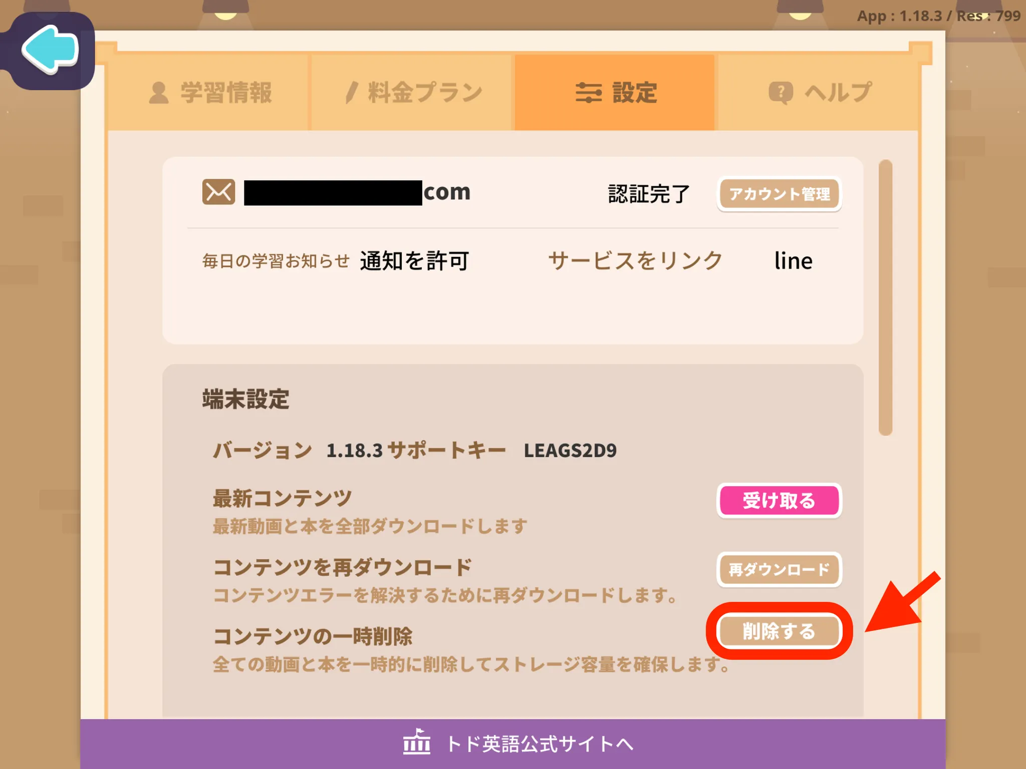 端末の空き容量を増やすには、トド英語アプリ内の[コンテンツの一時削除]機能をお試しください。一度全てのコンテンツを削除後、必要なコンテンツのみ再ダウンロードすることで、空き容量を増やすことができます。コンテンツの一時削除機能について、詳しくはこちらをご覧ください。