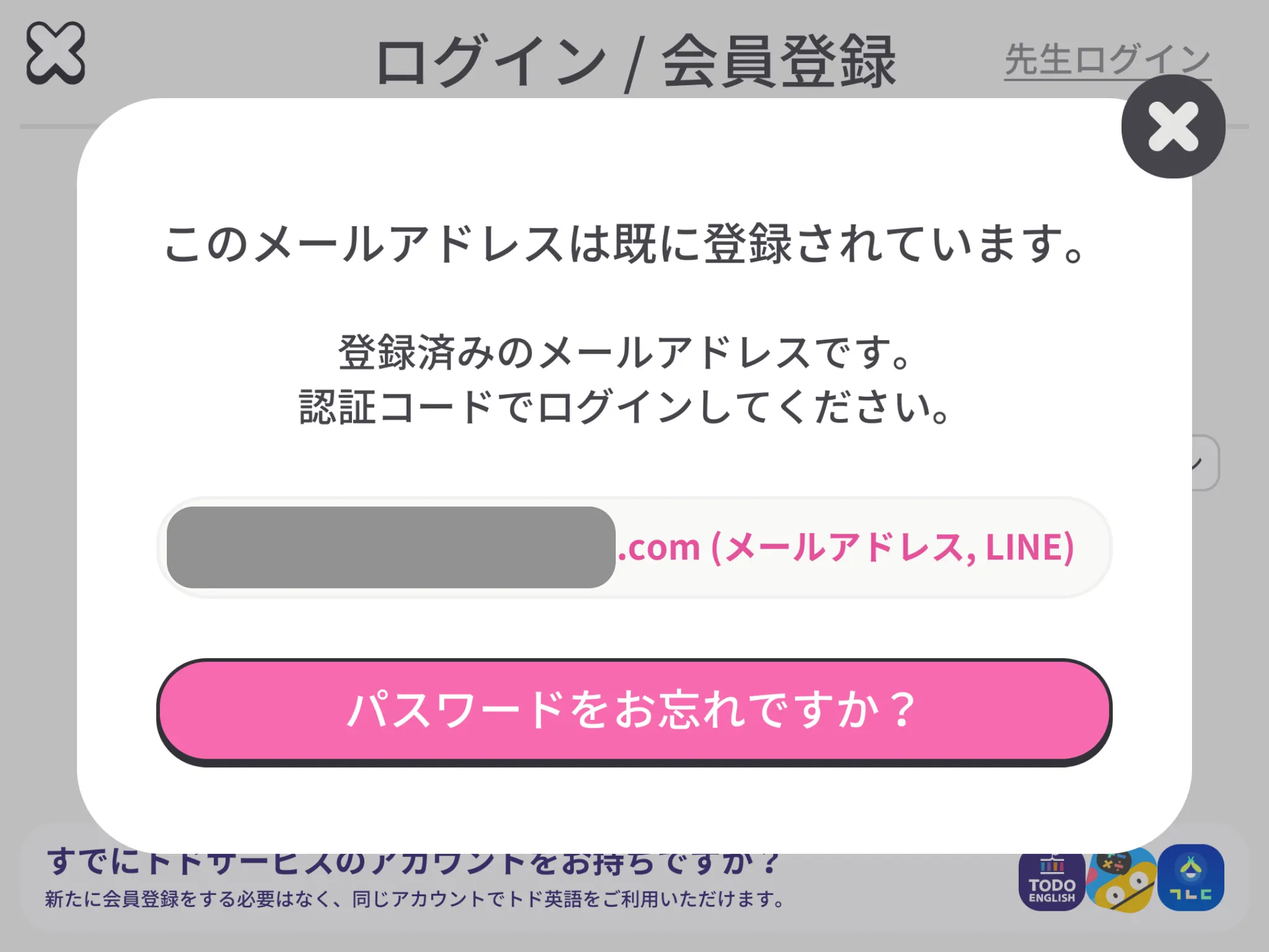 ※ 以前にアカウントを作成されたことがある場合で、ログイン方法やパスワードが分からず、以下のような画面が表示される場合は、[パスワードをお忘れですか?]から、認証コードでのログインをお試しください。