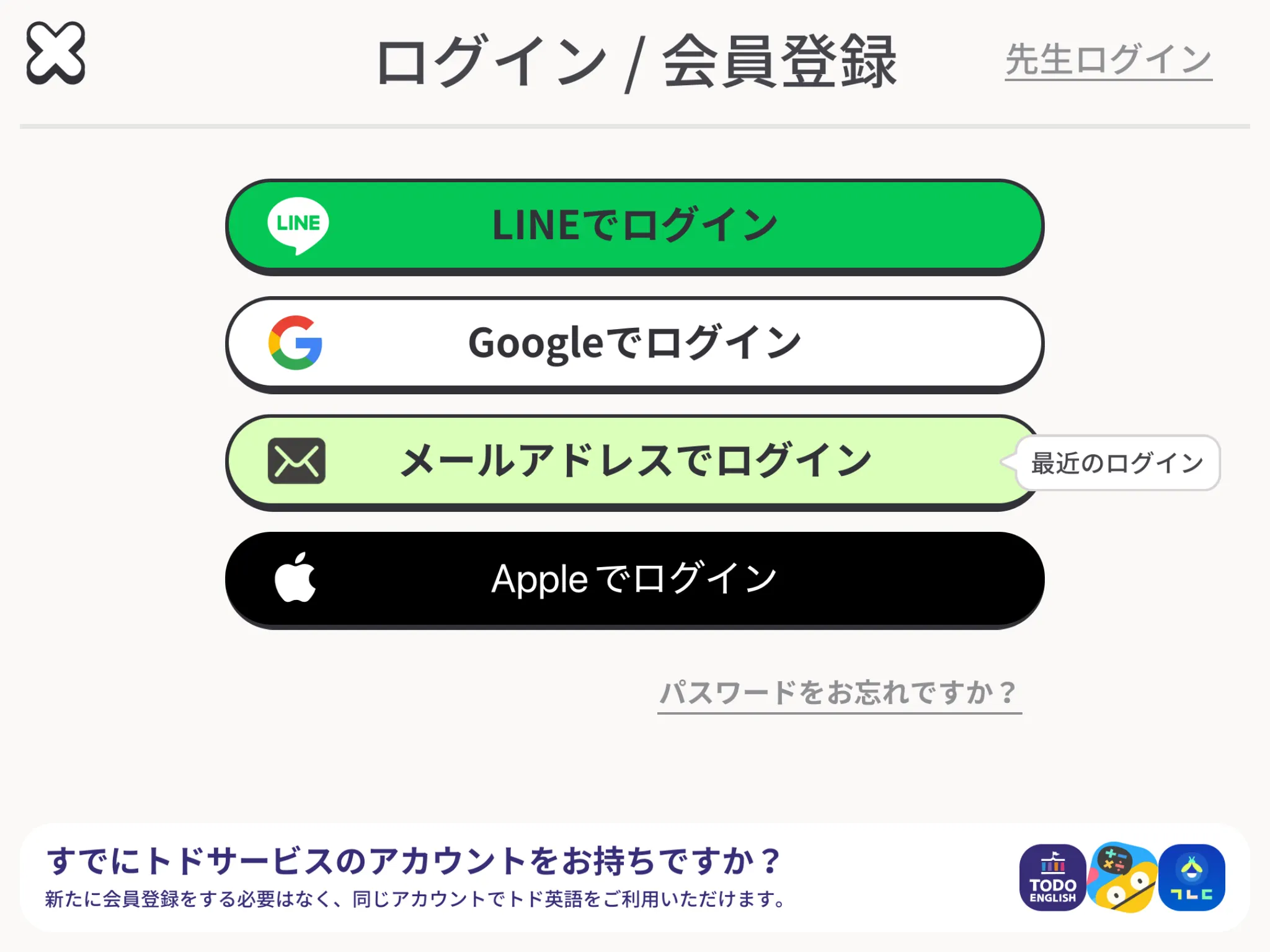 ※ トド英語アプリや公式サイトのログイン方法は共通です。どちらへも会員登録時に選択した方法(アカウント)でログインをお願いします。