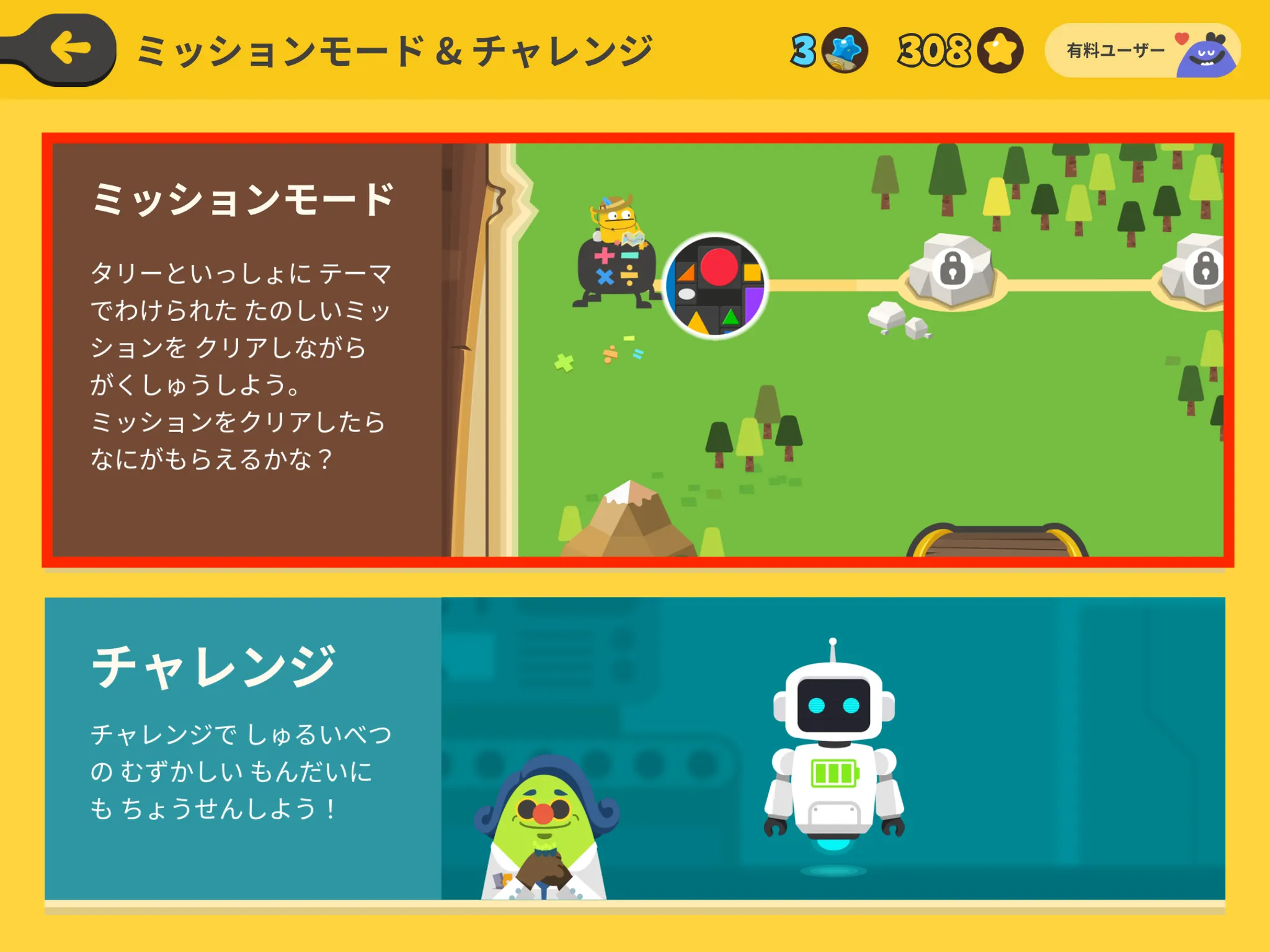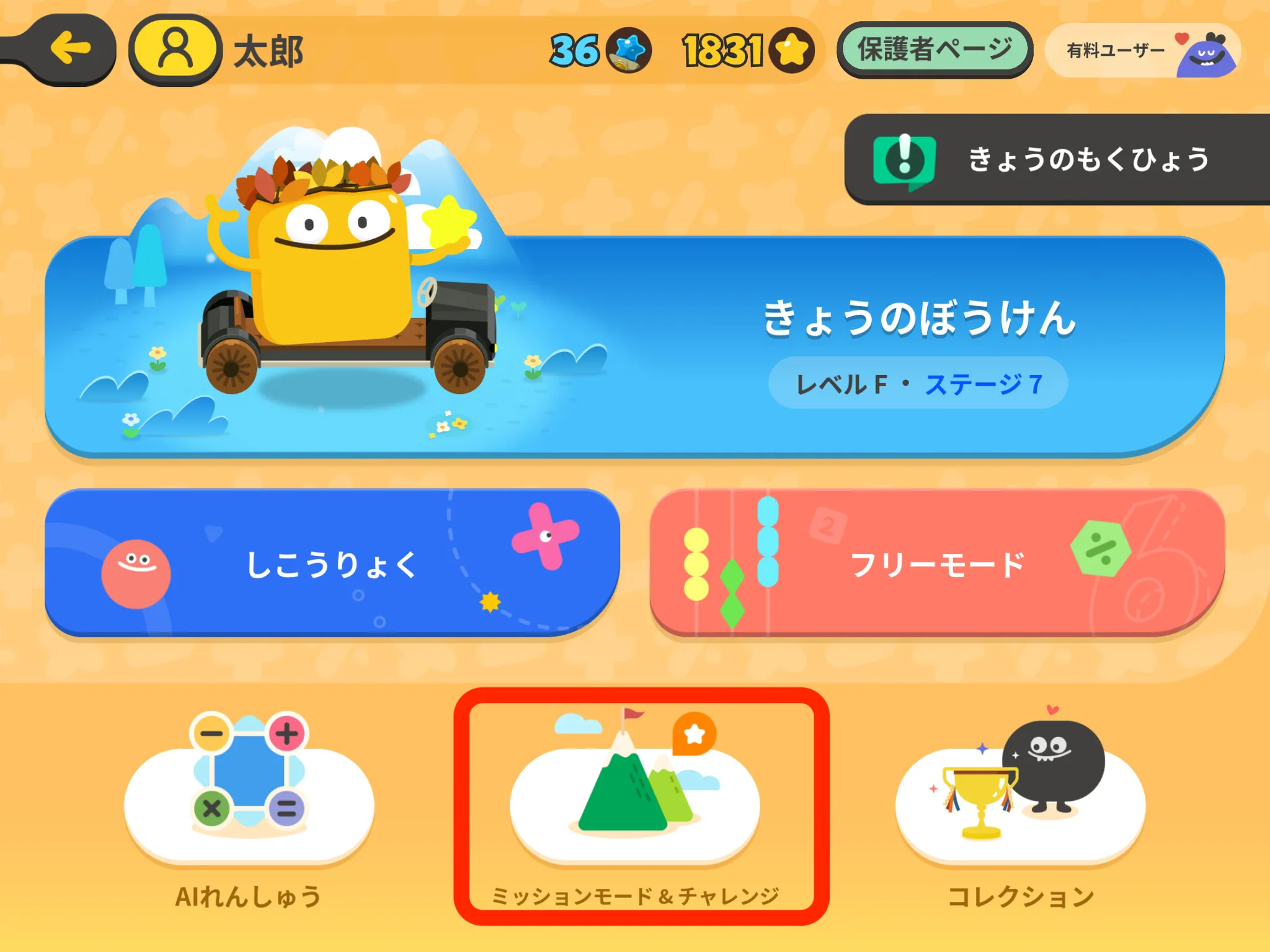 「きょうのぼうけん」をプレイした後に、学習した内容に関する単元のミッションを選んで、プレイすることをおすすめします。