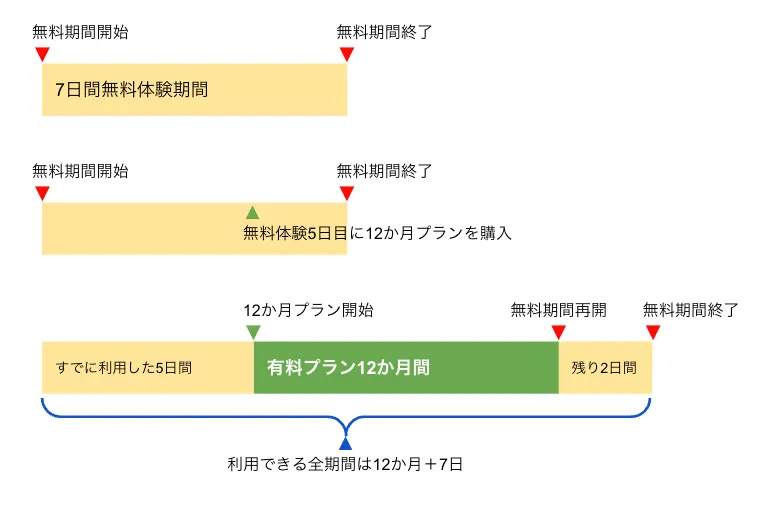 例えば、7日間の無料期間中の5日目に「12か月プラン」を購入する場合、購入したタイミングから有料プランがはじまり、残った無料期間2日分は有料プランの後ろに付きます。