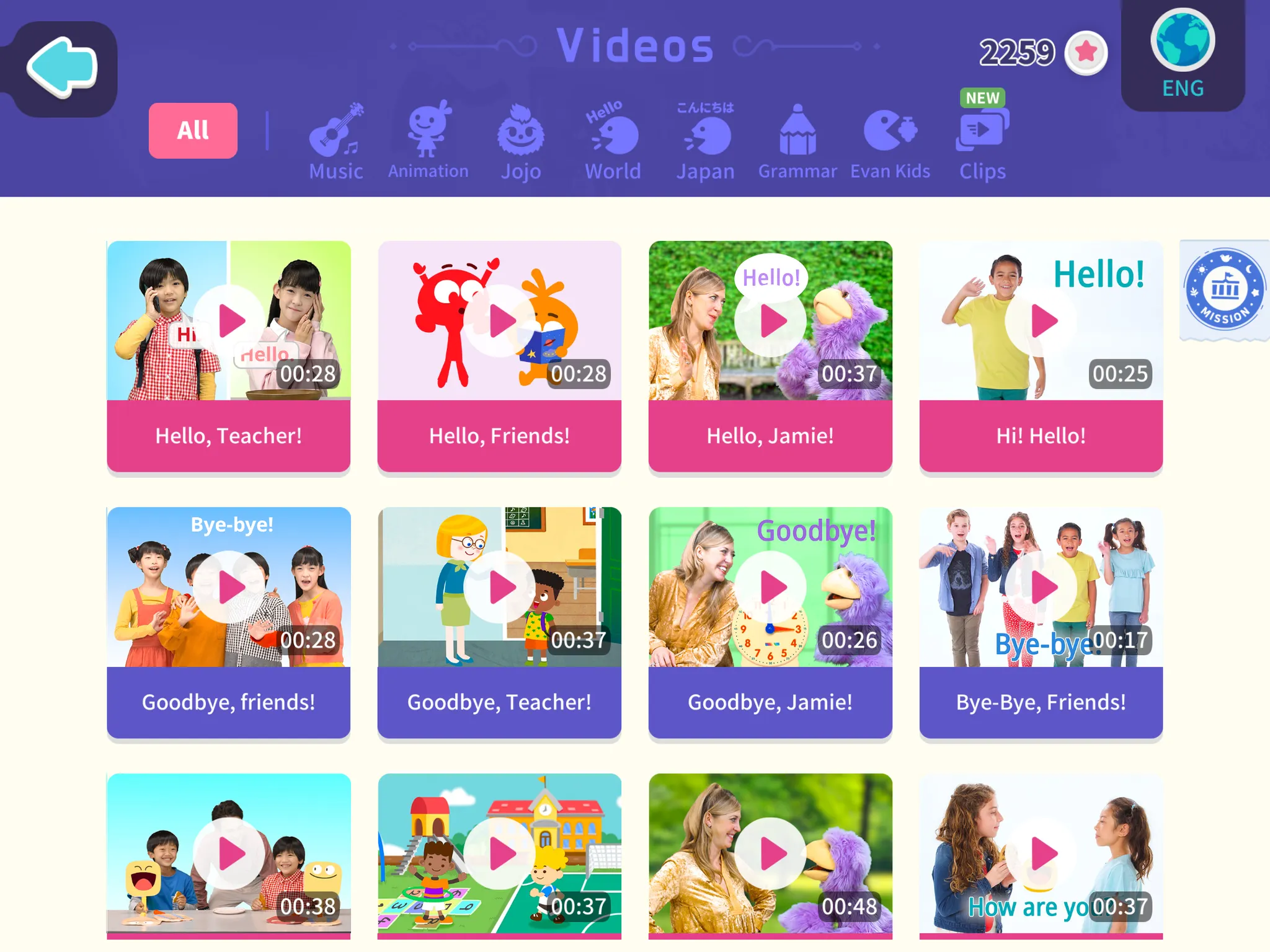 「Music」「Animation」「Jojo」「World」「Japan」「Grammar」「Evan Kids」の7つのカテゴリがあり、いろんな動画を楽しめます。