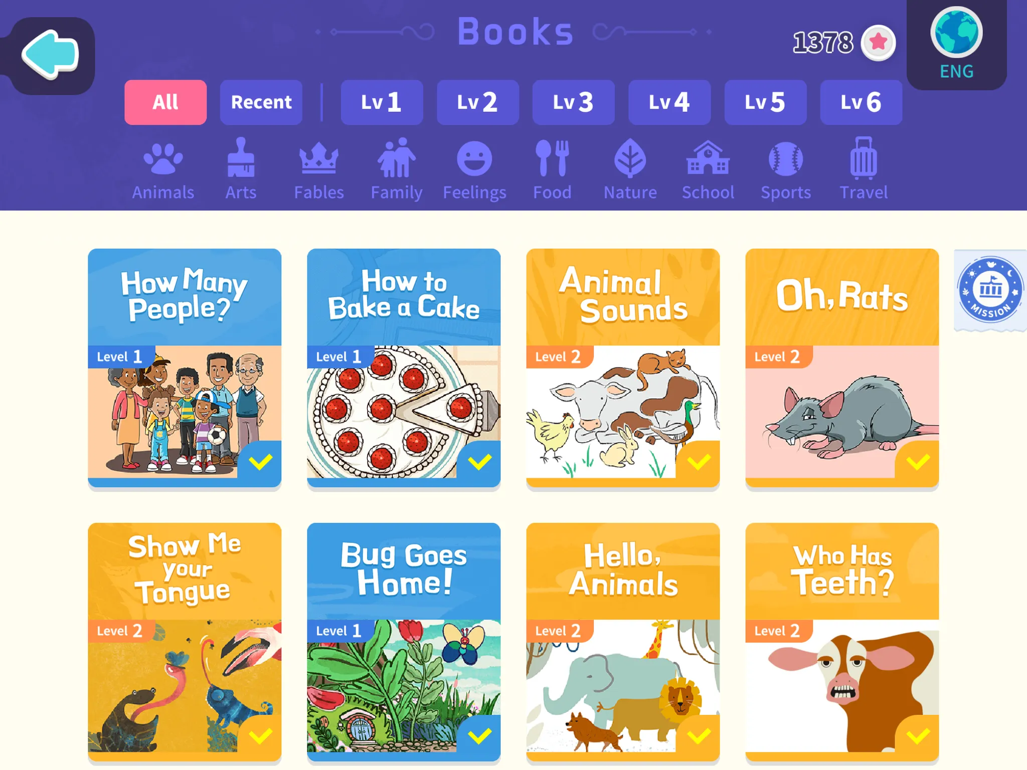 「Animals」「Arts」「Fables」「Family」「Feeling」「Food」「Nature」「School」「Sports」「Travel」の10個のカテゴリがあり、いろんな絵本を楽しめます。