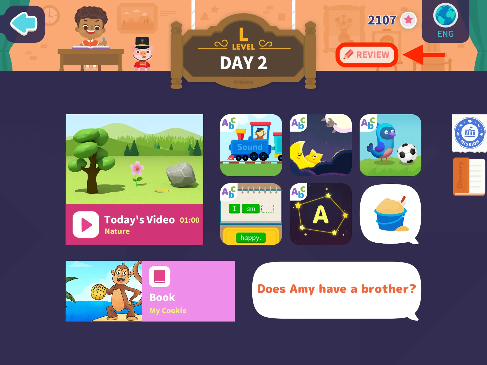 ・じゆうにえらぶ(Free Choice)で1日に2〜3つプレイし、英語を楽しく学びます。