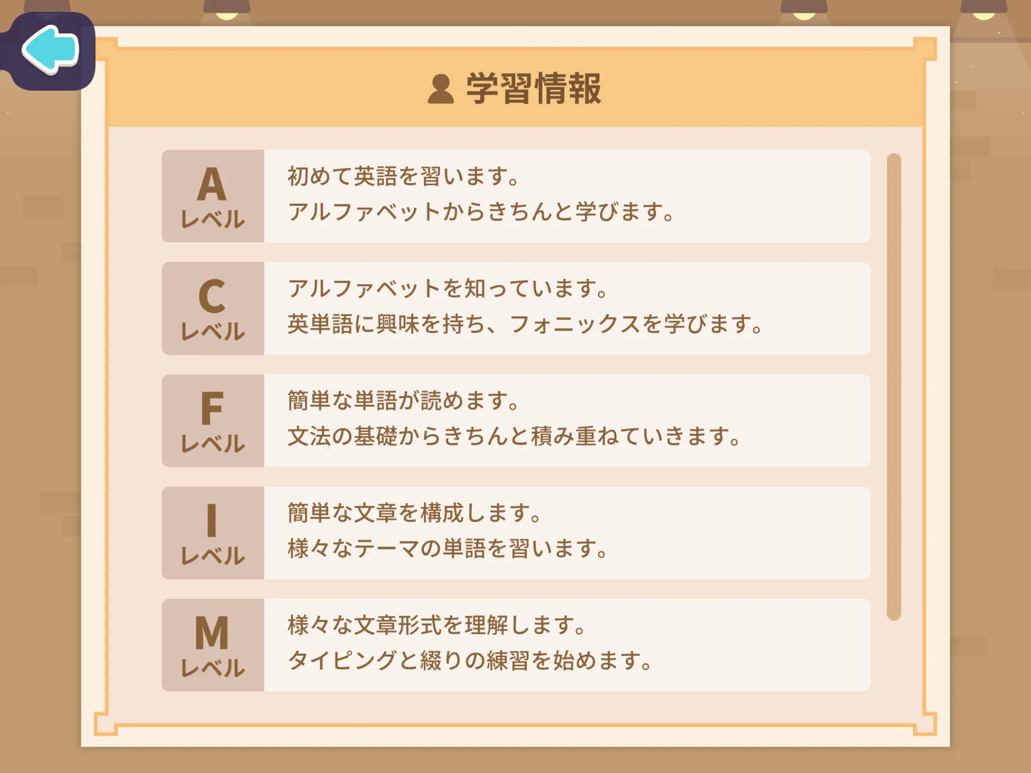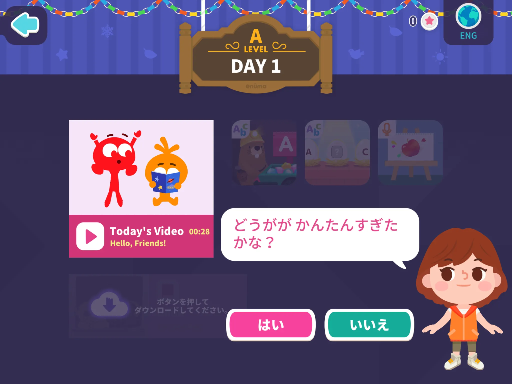 チュートリアルのDay1がお子さまのレベルに合わない場合は、プレイ途中で左上の矢印をタップし、やめることができます。