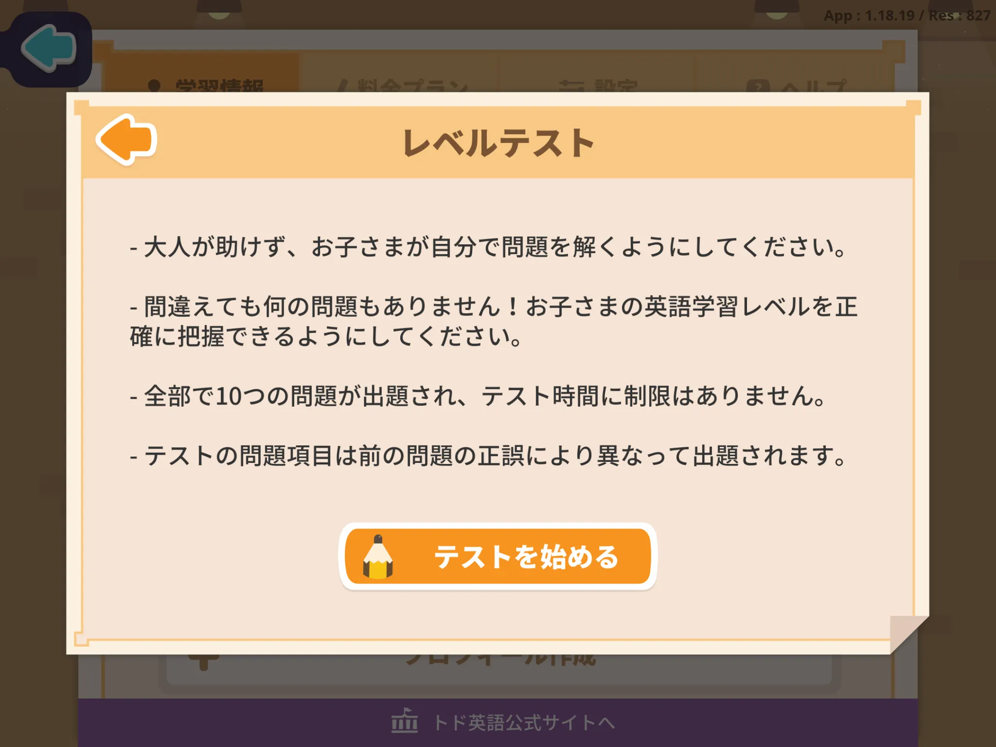 「レベルテストで学習レベルを決める」を選択すると、レベルテスト開始のポップアップが表示されます。正確なレベルを把握するために、必ずお子さま1人で問題を解くようにしてください。