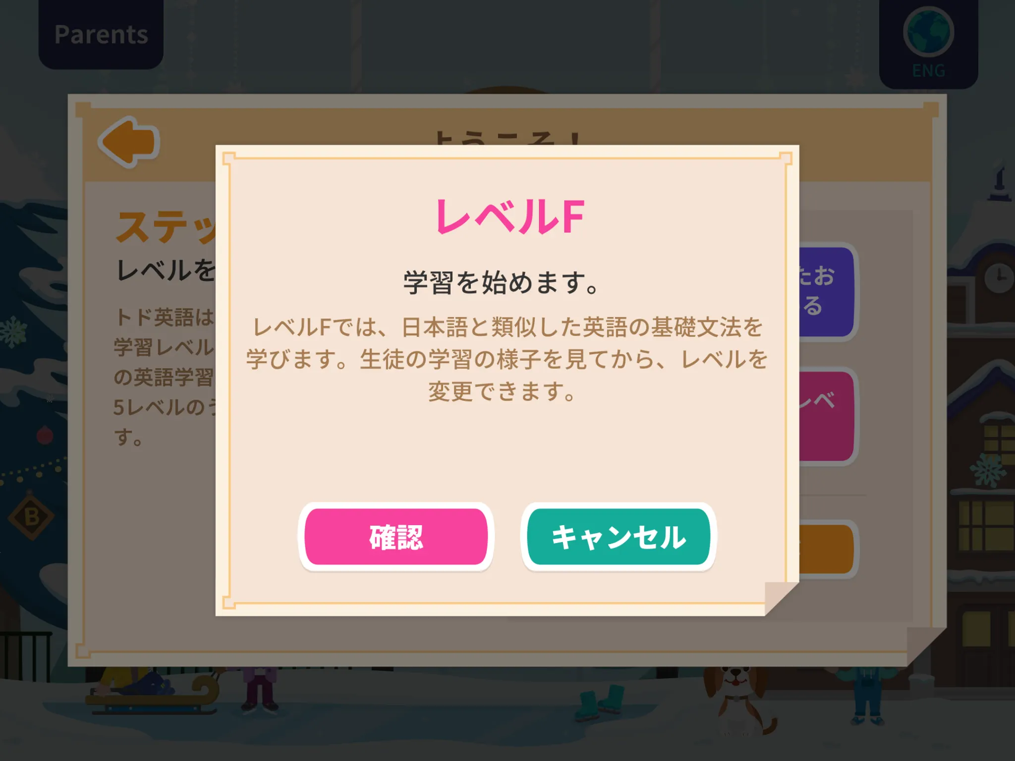 「子どもの年齢に合ったおすすめレベルで始める」を選択すると、ポップアップが表示されますので、「確認」をタップしてください。