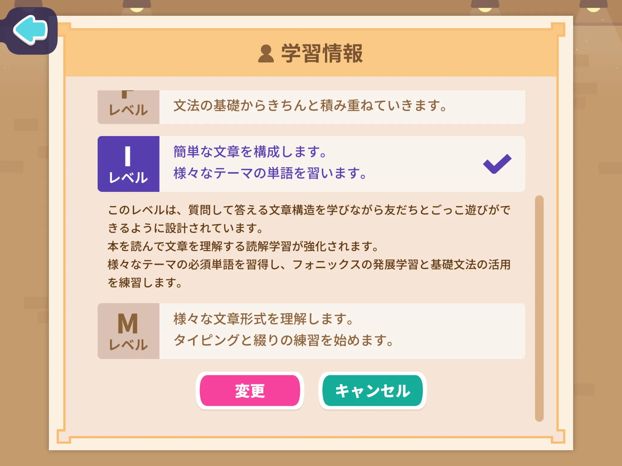 学習情報画面が表示されたら、変更するレベルを選択し「変更」をタップしてください。