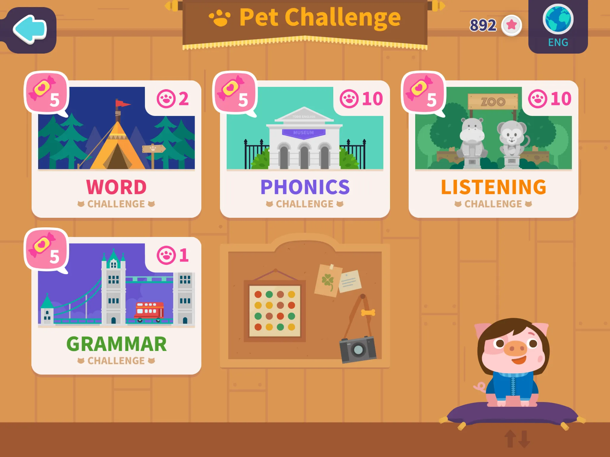 ペットチャレンジは、お子さまの学習レベルとは関係なく全てのカリキュラムで出てくる単語と表現を学習するためのイベントゲームです。4つのチャレンジがあり、それぞれ以下のレベルから出現します。