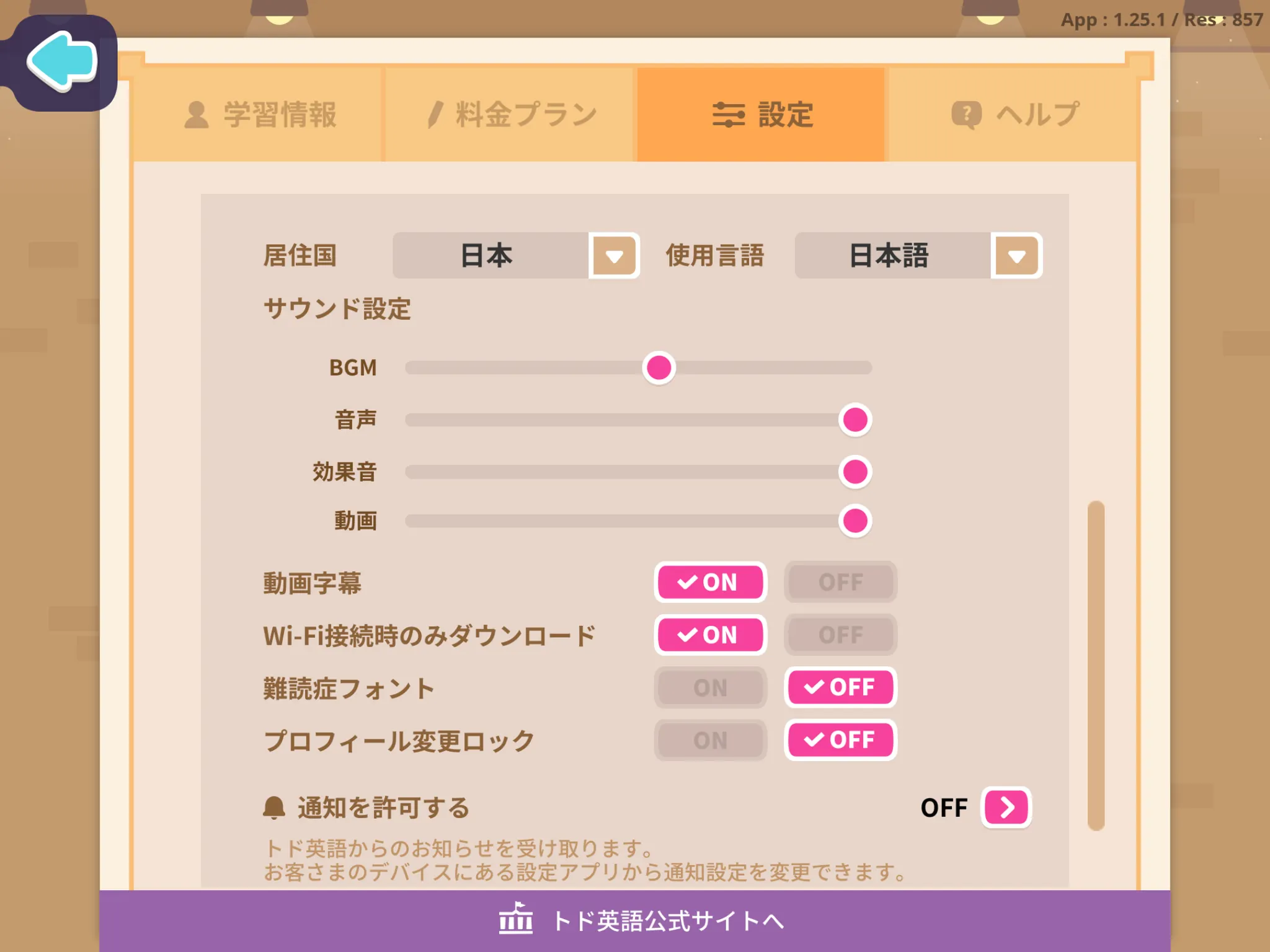 トド英語にはサウンド調整機能があります。[Parents]>[設定]タブでサウンド設定をご確認ください。BGM、音声、効果音、動画のボリュームをそれぞれ調整可能です。