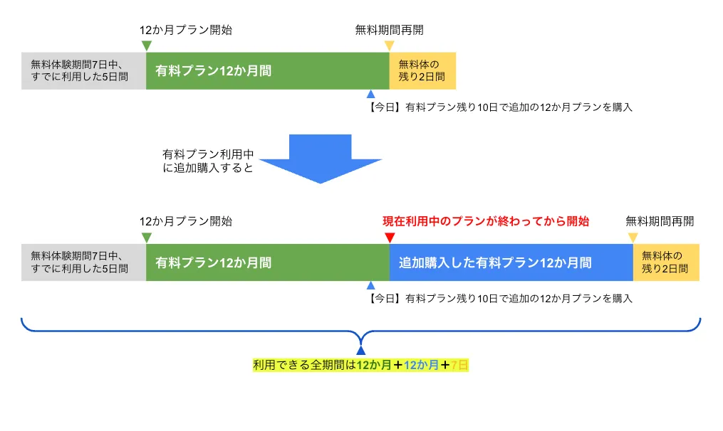 例:7日間無料体験中に有料プランを購入し、有料プランご利用中に、さらに追加で有料プランを購入した場合、利用できる全期間は「12か月+12か月+7日」。