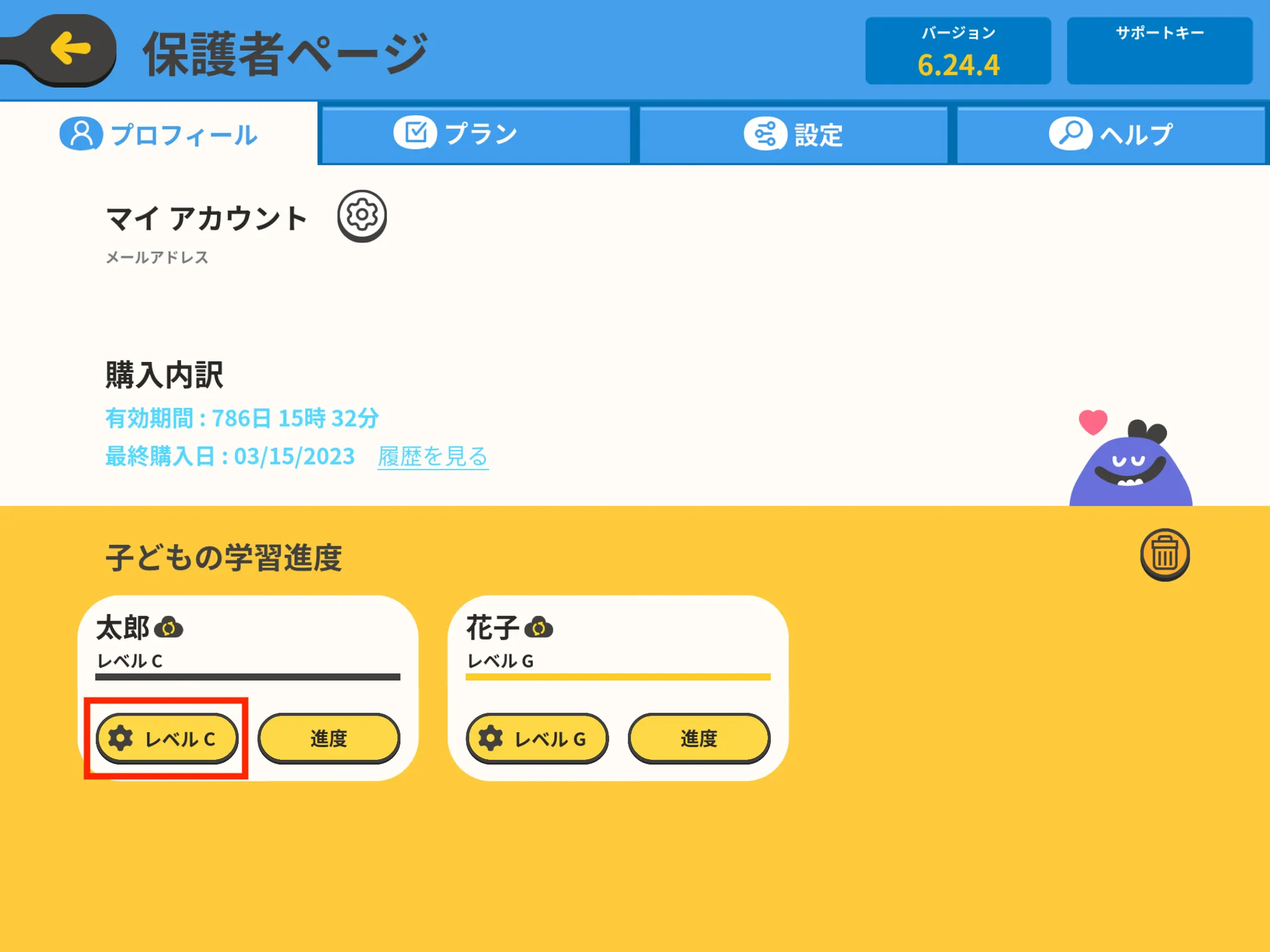 トドさんすうアプリの[保護者ページ]>[プロフィール]>子どもの学習進度項目で、