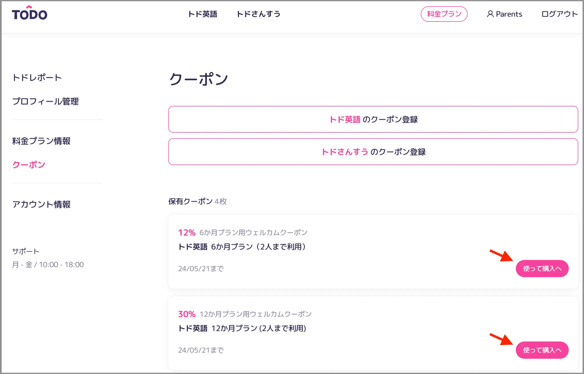 お持ちのクーポンは、トド英語公式サイトの[Parents]>[クーポン]ページでご確認いただけます。