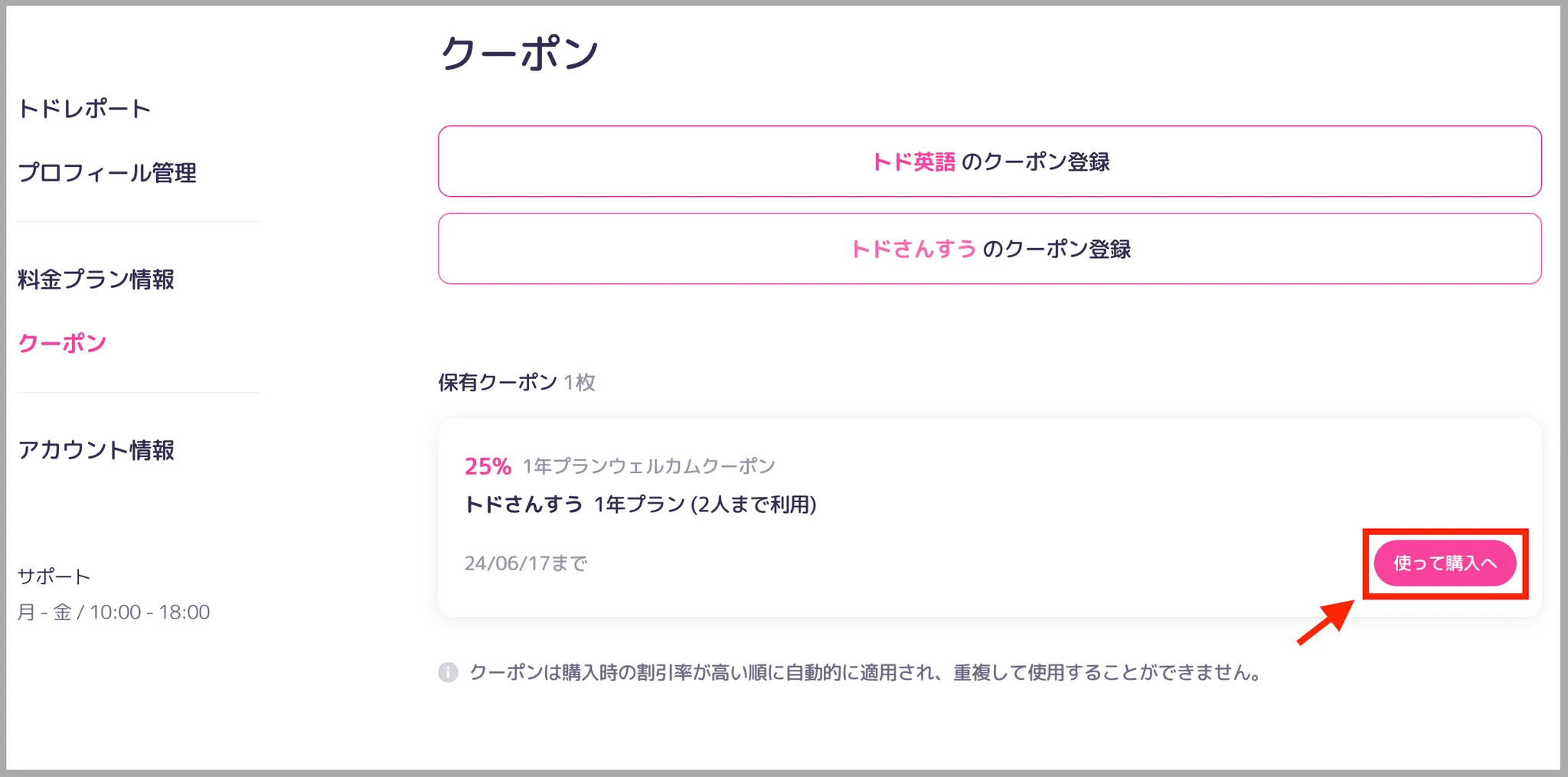 お持ちのクーポンは、トドさんすう公式サイトの[Parents]>[クーポン]ページでご確認いただけます。