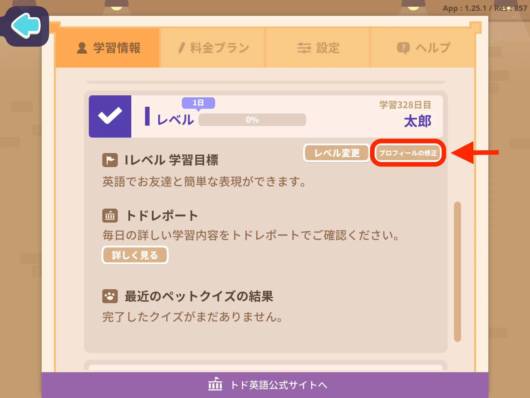 トド英語アプリの[Parents]>[学習情報]>[プロフィールの修正]をタップすると、公式サイトに移ります。