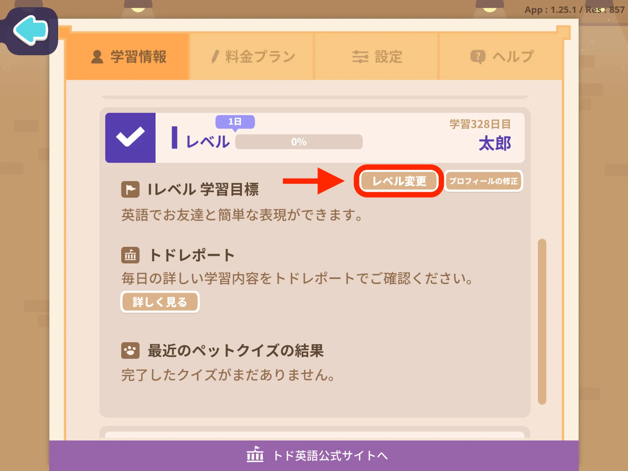 レベルの変更であれば、トド英語アプリの[Parents]>[学習情報]>[レベル変更]をタップすると、アプリから直接変更することもできます。