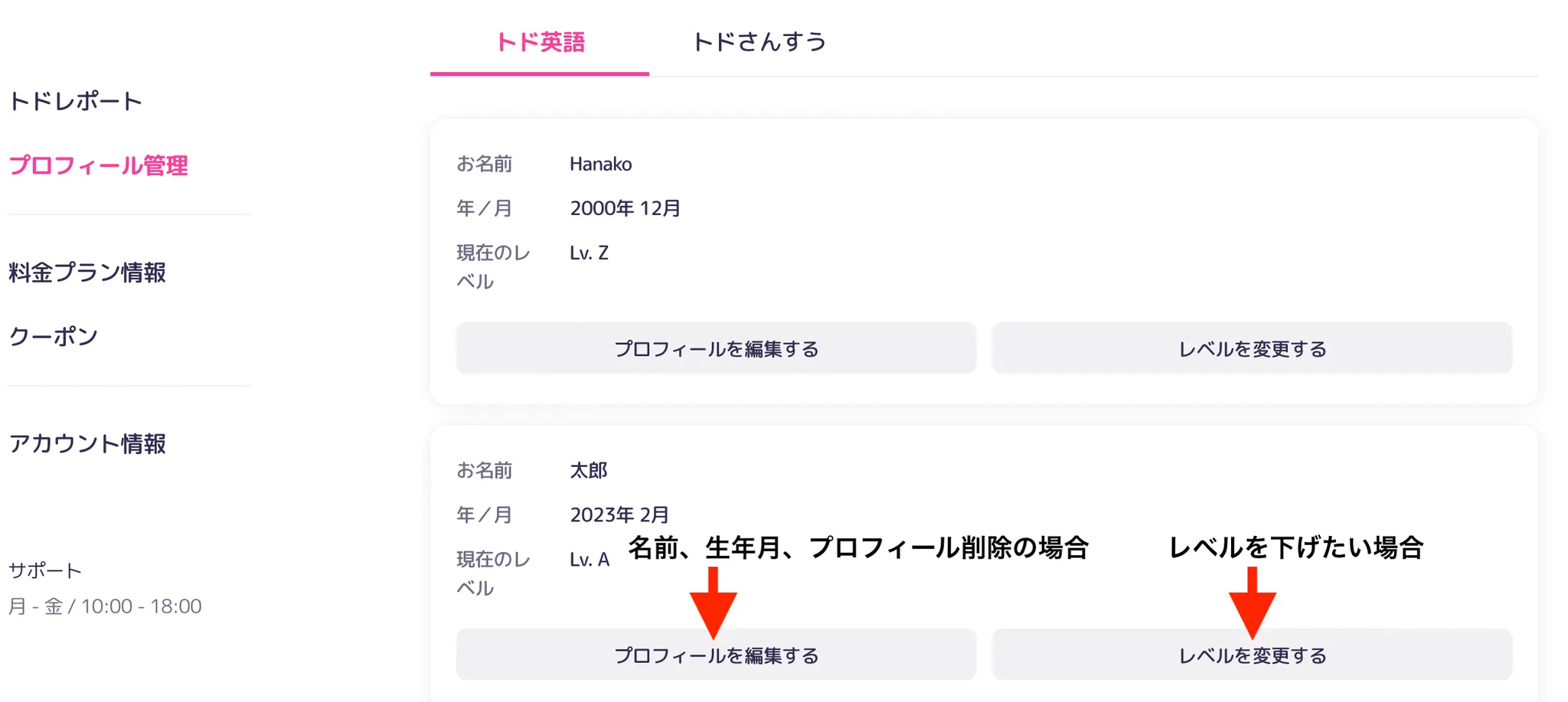 トド英語公式サイトの[プロフィール管理]では、以下のプロフィール変更が可能です。