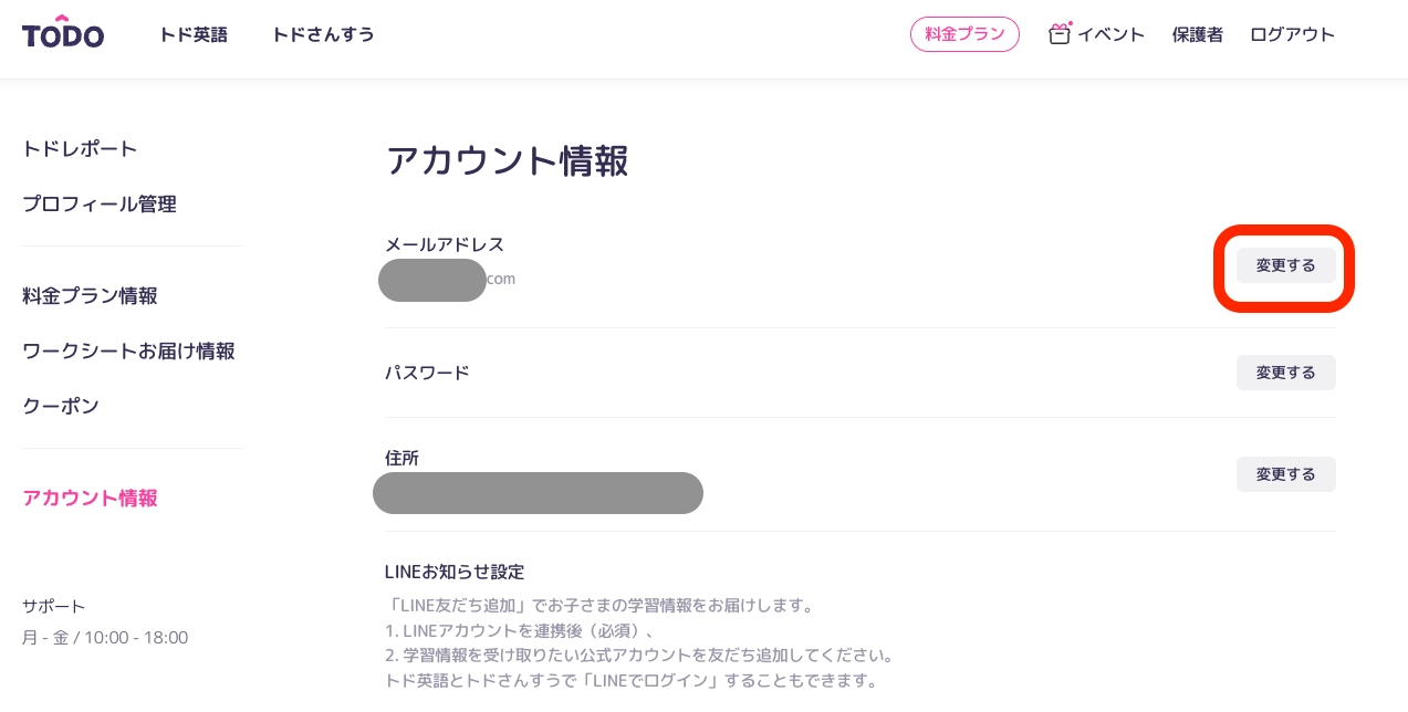 公式サイトからメールアドレスを変更する場合は、トドさんすう公式サイトの[保護者ページ]>[アカウント情報]> メールアドレスの[変更する]をタップしてください。