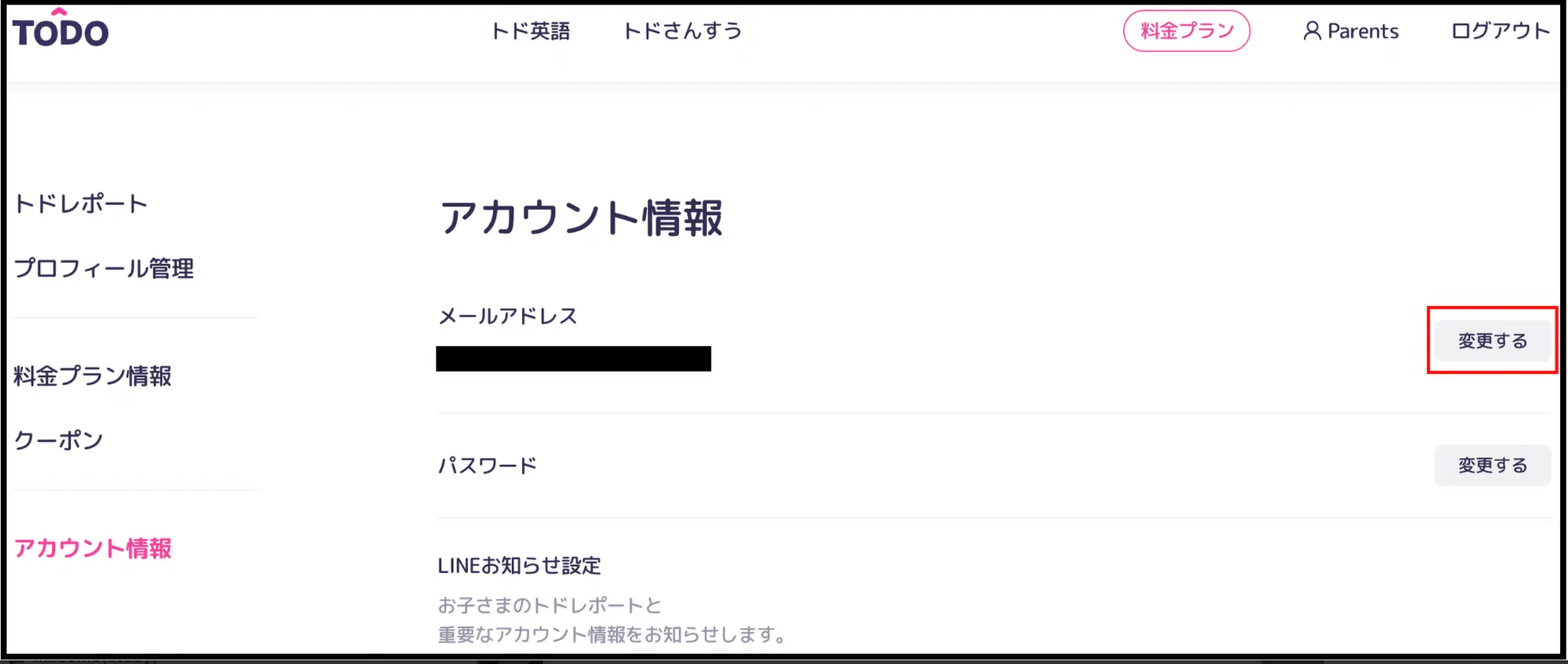 公式サイトからメールアドレスを変更する場合は、トドさんすう公式サイトの[Parents]>[アカウント情報]> メールアドレスの[変更する]をタップしてください。