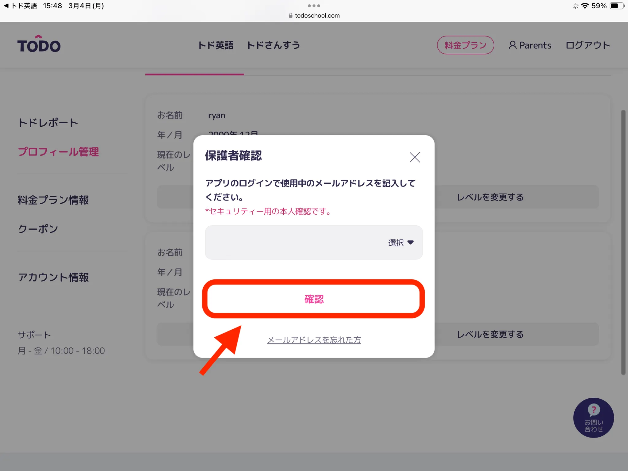 本人確認が必要です。アカウントのメールアドレスを入力し[確認]をタップしてください。