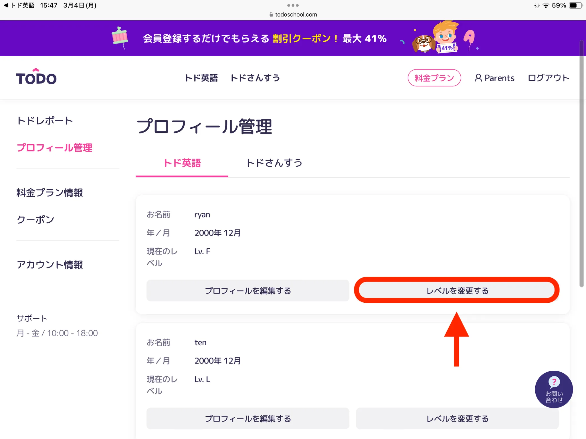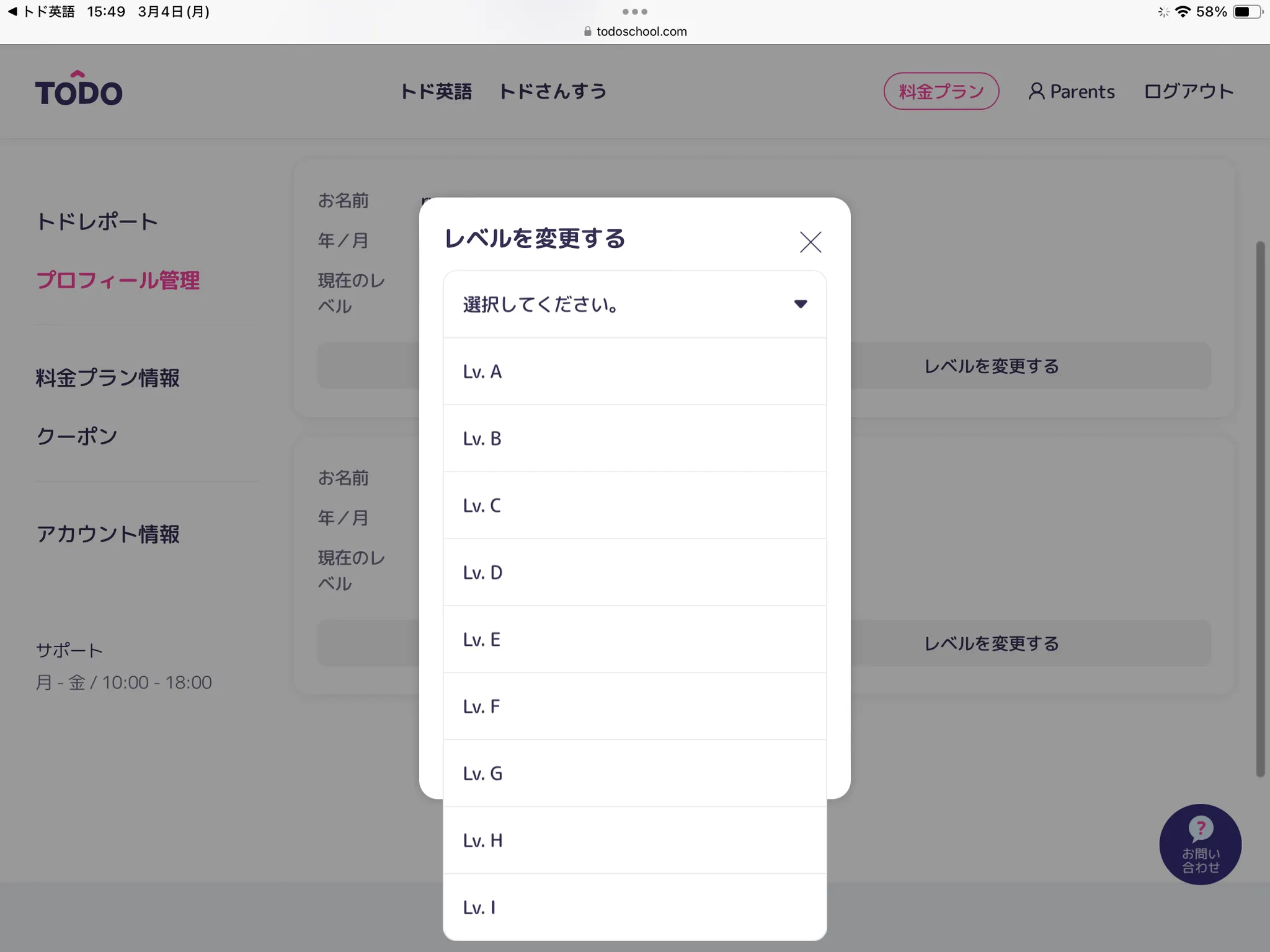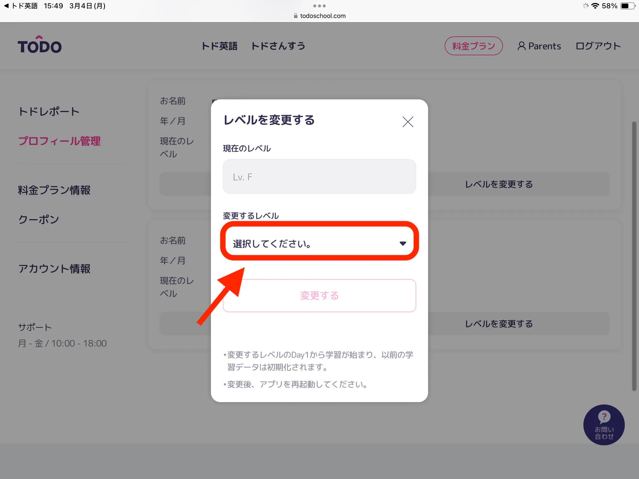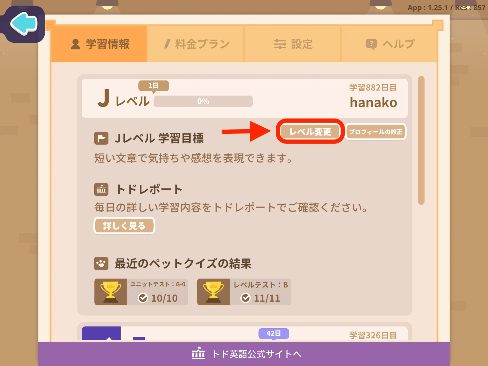 トド英語アプリ[Parents]>[学習情報]>変更するお子さまのプロフィール名の下にある[レベル変更]をタップしてください。