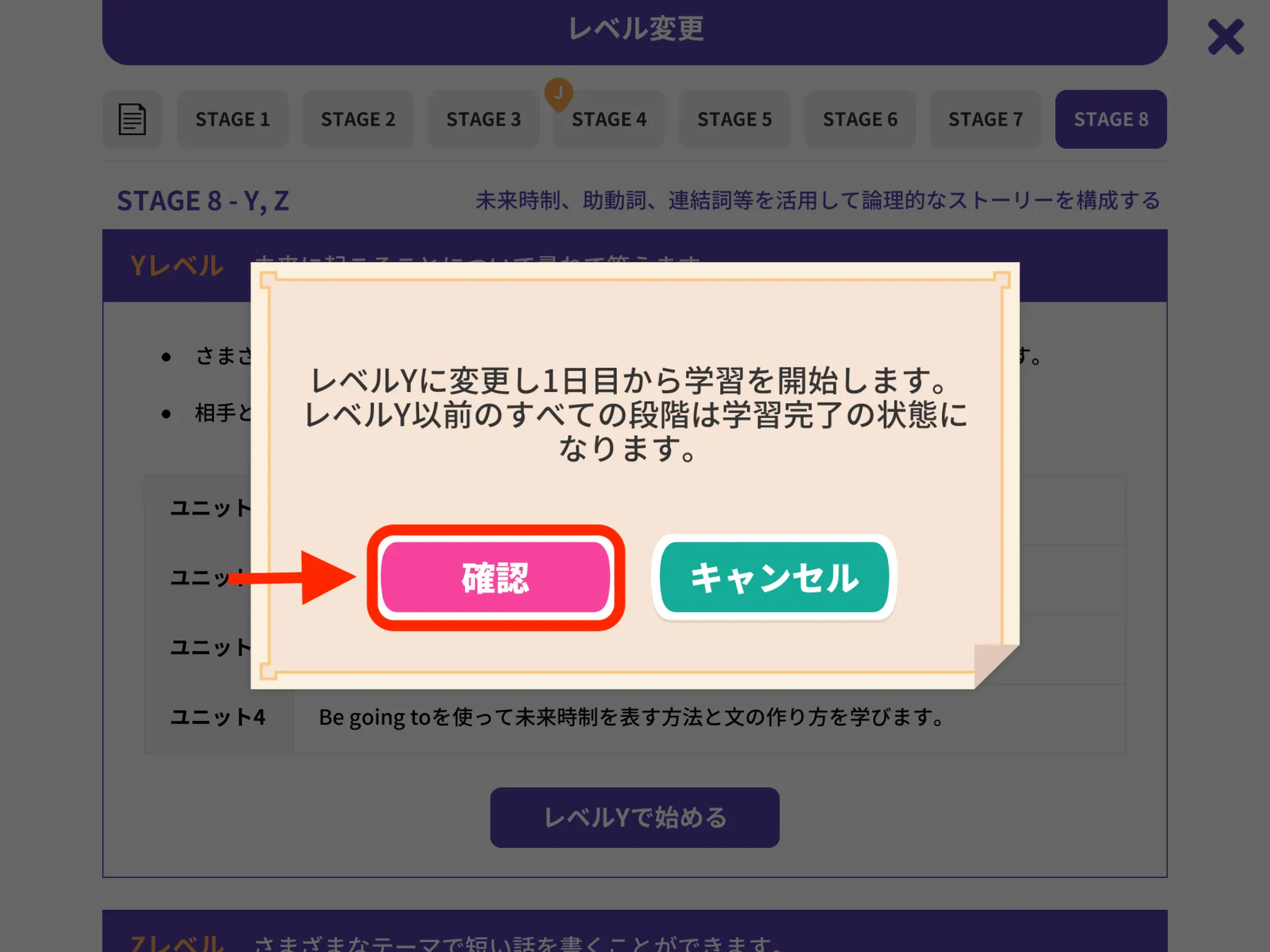 レベル変更画面が表示されたら、[STAGE◯]>[レベル◯で始める]>[確認]をタップしてください。