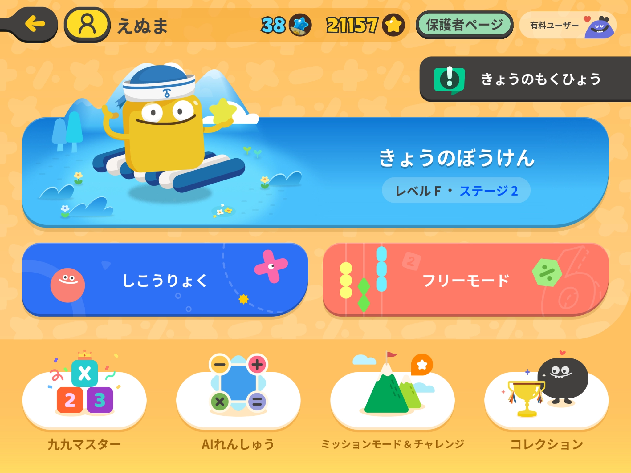 この他にも、「しこうりょく」がプレイできたり、レベルが上がるにつれて「九九マスター」、「AIれんしゅう」、「チャレンジ」などの学習メニューが増えていきます。