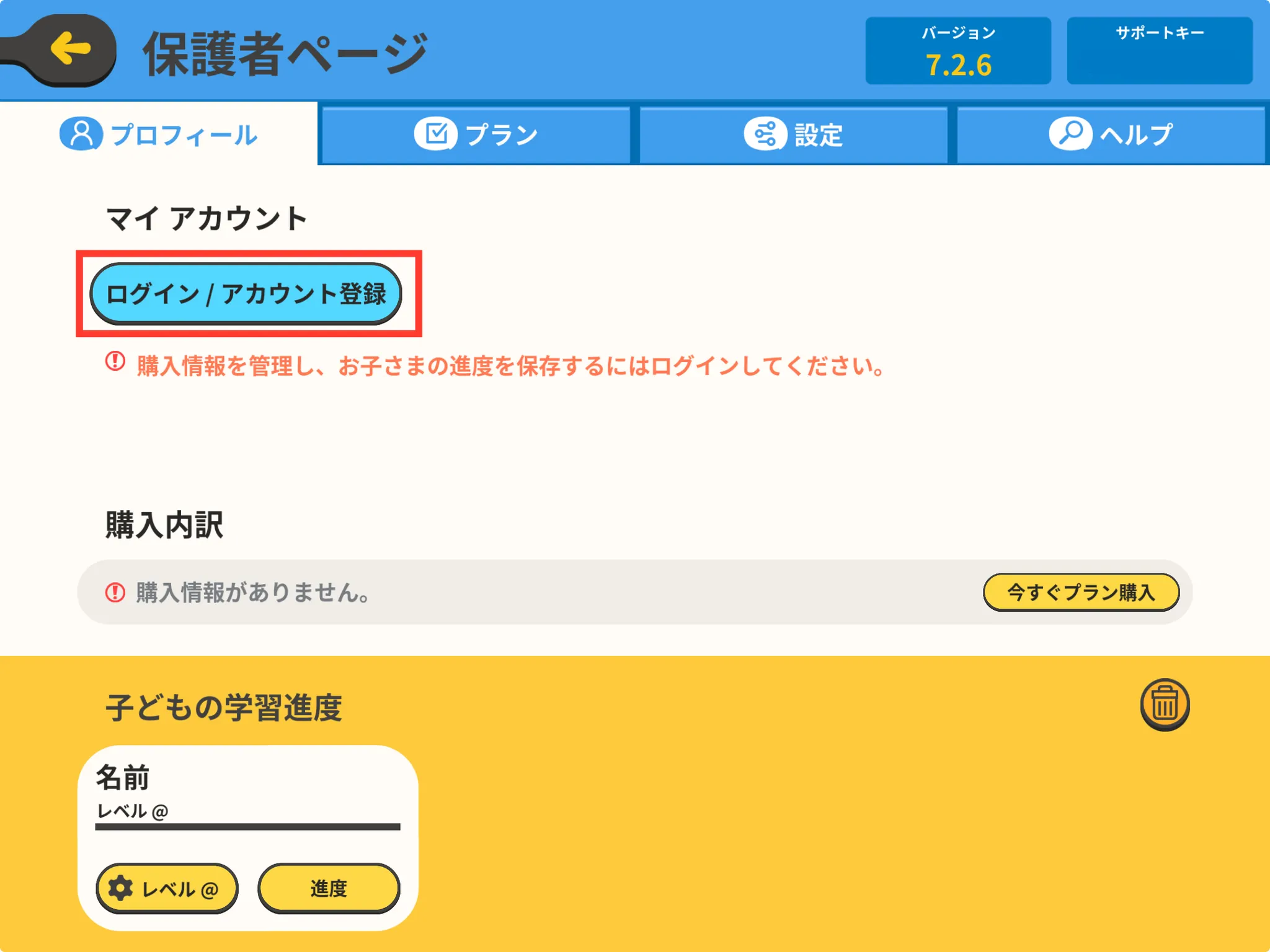 会員登録をされた場合は、トドさんすうアプリの[保護者ページ]>[プロフィール]>マイアカウントの[ログイン / アカウント登録]をタップしてください。