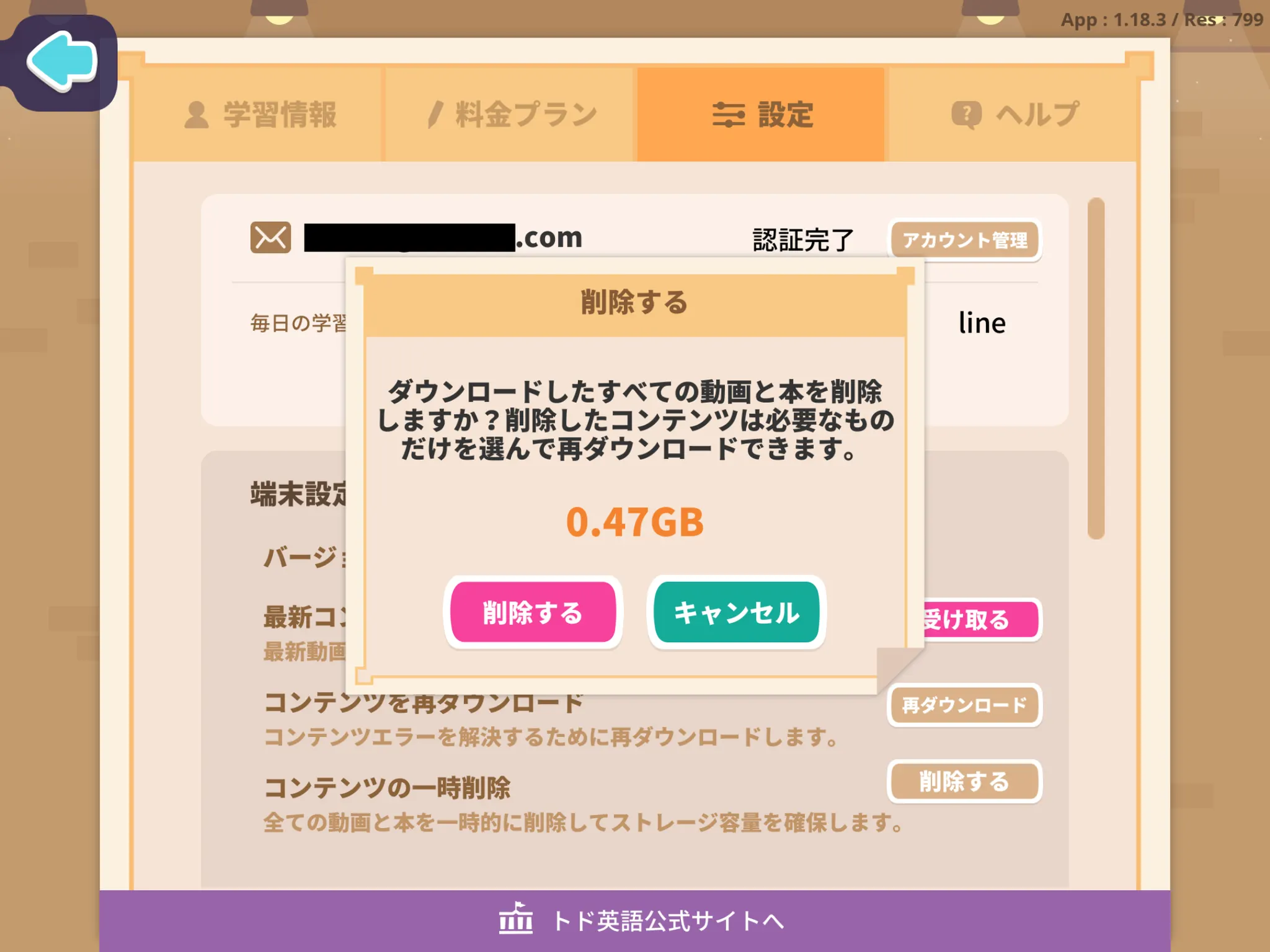 トド英語アプリの[Parents]>[設定]>コンテンツの一時削除の[削除する]をタップしてください。