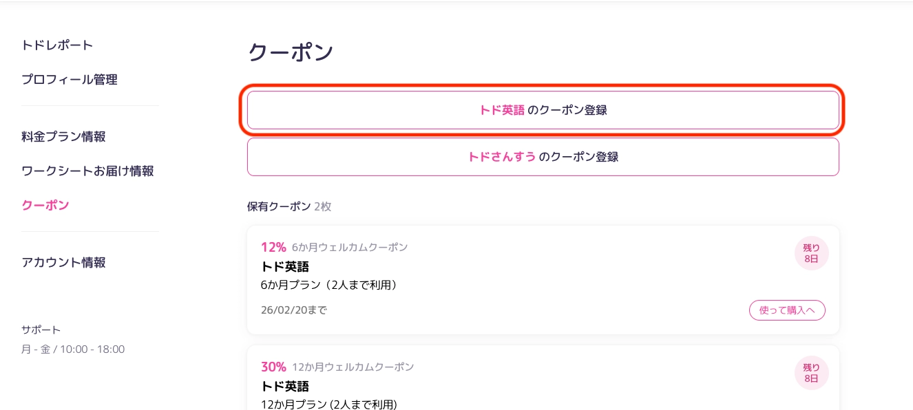 現在利用中のプランがない場合(トド英語をはじめて利用する場合)、クーポンを登録した時点で利用開始となりますので、ご注意ください。
